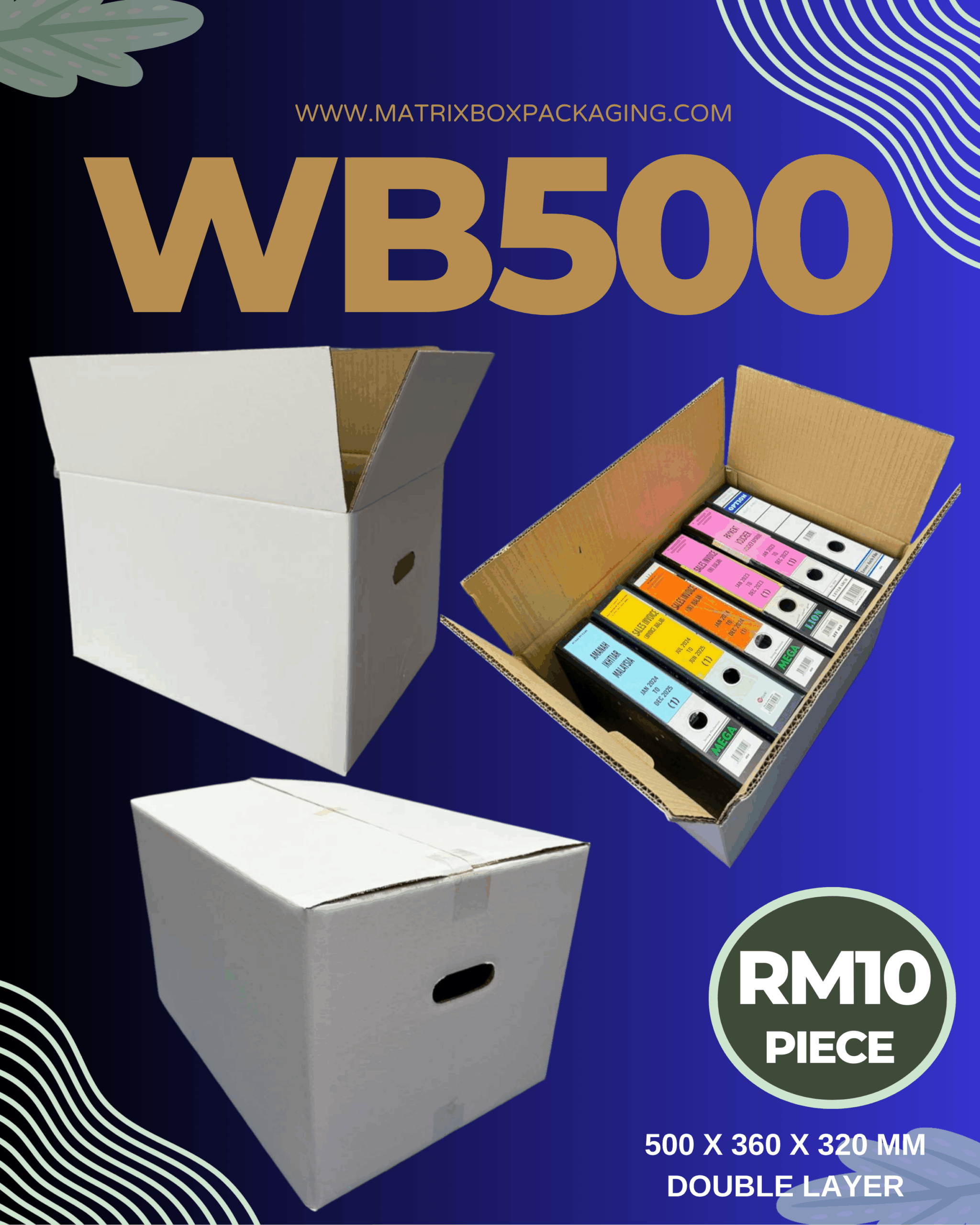 The WB500 is a heavy-duty white carton box specially designed for secure packing, shipping, and storage. Built with double-wall corrugated material, it provides superior strength and protection, making it suitable for heavier loads and fragile items.